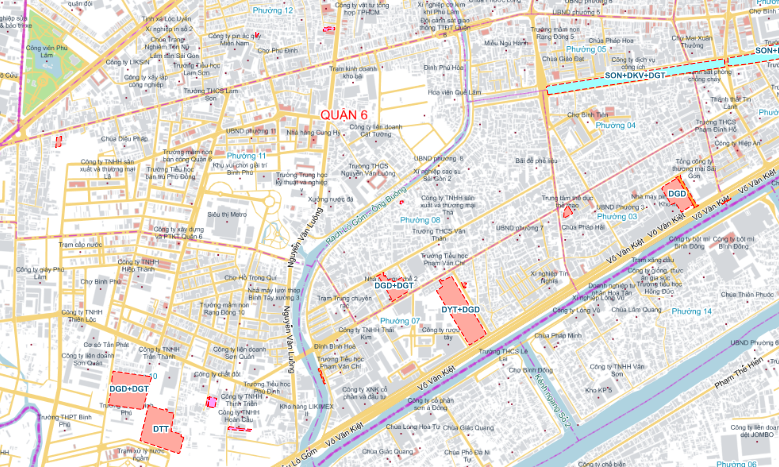 - Quận 6 là quận nội thành nằm về phía Tây Nam của thành phố Hồ Chí Minh (trong tổng số 22 quận, huyện, Thành phố), địa hình tương đối bằng phẳng, địa dạng trông giống như một hình tam giác đều, ở khoảng tọa độ 10°43’45” – 10°44’43” vĩ tuyến Bắc và 106°20’24” kinh tuyến Đông. Quận 6 gồm 14 phường với tổng diện tích tự nhiên 713,83 ha, chiếm 0,34% tổng diện tích tự nhiên của toàn Thành phố. - Kế hoạch sử dụng đất năm 2023 Quận 6 dựa trên nhu cầu sử dụng đất của các ngành, lĩnh vực, cá nhân, tổ chức đăng ký và các chỉ tiêu sử dụng đất chưa thực hiện hết trên cơ sở chỉ tiêu sử dụng đất phân khai cho Quận 6 (tại Văn bản số 3652/UBND-ĐT ngày 16 tháng 8 năm 2018 của Ủy ban nhân dân thành phố Hồ Chí Minh) theo phương án Điều chỉnh quy hoạch sử dụng đất đến năm 2020 và kế hoạch sử dụng đất kỳ cuối (2016 - 2020) của Thành phố Hồ Chí Minh đã được Chính phủ phê duyệt theo Nghị quyết số 80/NQ-CP ngày 19 tháng 6 năm 2018. - Kế hoạch sử dụng đất năm 2023 Quận 6 thực hiện 20 dự án. Trong đó 18 dự án chuyển tiếp từ kế hoạch năm 2022 và 02 dự án đăng ký mới năm 2023, nhu cầu chuyển mục đích sử dụng đất của hộ gia đình, cá nhân là 0,13 ha. - Bản đồ Kế hoạch sử dụng đất năm 2023 Quận 6 được thu thập, chuẩn hóa và cung cấp dữ liệu qua dịch vụ Web theo tiêu chuẩn OGC WFS, WMTS, WMS.