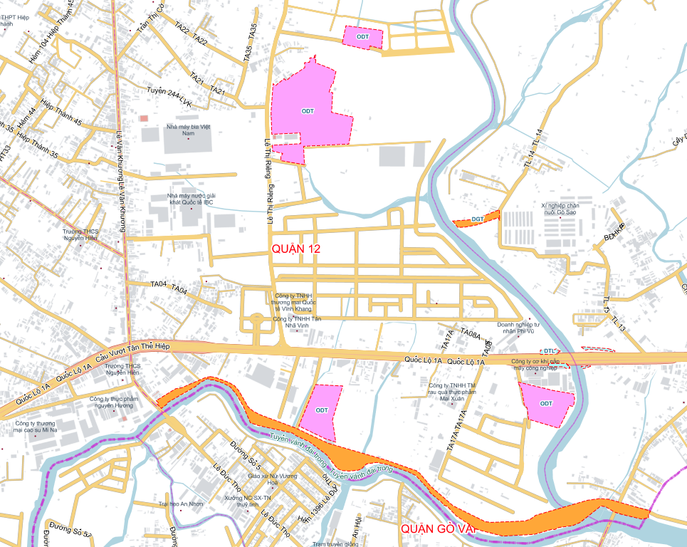 - Quận 12 nằm về phía Tây Bắc của Thành phố Hồ Chí Minh, Quận có diện tích tự nhiên 5.273.93 ha, bằng 2,25% diện tích toàn Thành phố, với dân số năm 2021 là 642.331 người, mật độ dân số là 12.180 người/km2. Quận 12 được chia thành 11 đơn vị hành chính: Phường Thạnh Xuân 971,08ha, phường Thạnh Lộc 584,0 ha, phường Hiệp Thành 543,66 ha, phường Thới An 518,74 ha, phường Tân Chánh Hiệp 421,82 ha, phường An Phú Đông 875,34 ha, phường Tân Thới Hiệp 261,87 ha, phường Trung Mỹ Tây 271,08 ha, phường Tân Hưng Thuận 180,57 ha, phường Đông Hưng Thuận 255,95 ha và phường Tân Thới Nhất 389,83 ha. - Kế hoạch sử dụng đất năm 2023 Quận 12 là nhiệm vụ phải thực hiện, nhằm cụ thể hóa công tác quản lý và sử dụng đất trong năm 2023. Kế hoạch sử dụng đất sau khi được cơ quan nhà nước có thẩm quyền phê duyệt sẽ là cơ sở pháp lý cho công tác quản lý Nhà nước về đất đai, là căn cứ để giao đất, cho thuê đất, chuyển mục đích sử dụng đất, nhằm khai thác và phát huy hiệu quả nguồn lực đất đai để thực hiện các công trình, dự án phát triển kinh tế - xã hội của quận. - Kế hoạch sử dụng đất 2023 Quận 12 có 20 công trình, dự án, trong đó: 01 công trình, dự án đăng ký từ Kế hoạch sử dụng đất năm 2015; 1 công trình, dự án đăng ký từ Kế hoạch sử dụng đất năm 2016; 2 công trình, dự án đăng ký từ Kế hoạch sử dụng đất năm 2017; 1 công trình, dự án đăng ký từ Kế hoạch sử dụng đất năm 2018; 4 công trình, dự án đăng ký từ Kế hoạch sử dụng đất năm 2019; 1 công trình, dự án đăng ký từ Kế hoạch sử dụng đất năm 2020; 2 công trình, dự án đăng ký từ Kế hoạch sử dụng đất năm 2021 ; công trình, dự án đăng ký từ Kế hoạch sử dụng đất năm 2022; 3 công trình, dự án đăng ký mới Kế hoạch sử dụng đất năm 2023 - Bản đồ Kế hoạch sử dụng đất năm 2023 Quận 12 được thu thập, chuẩn hóa và cung cấp dữ liệu qua dịch vụ Web theo tiêu chuẩn OGC WFS, WMTS, WMS.