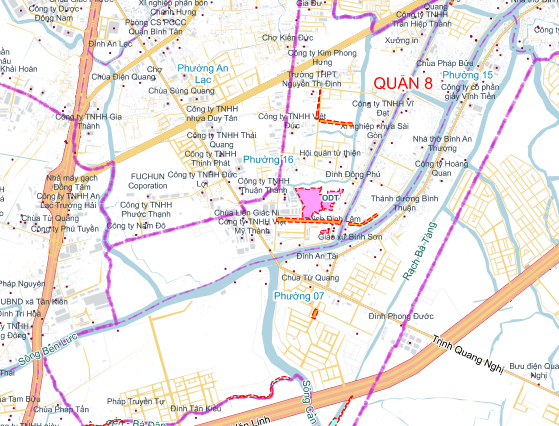 - Quận 8 thuộc khu vực nội thành và nằm ở phía Nam Thành phố Hồ Chí Minh, có tọa độ địa lý từ 10°45’8’’ đến 10°41’45’’ vĩ độ Bắc; 106°35’51’’ đến 106°41’22’’ kinh độ Đông. Phía Đông giáp Quận 4, Quận 7. Phía Tây giáp quận Bình Tân và huyện Bình Chánh. Phía Nam giáp huyện Bình Chánh. Phía Bắc giáp Quận 5, Quận 6. Quận có diện tích tự nhiên 1.911,39 ha, dân số 423.129 người, gồm 16 đơn vị hành chính cấp phường - Kế hoạch sử dụng đất năm 2023 Quận 8 là nhiệm vụ phải thực hiện, nhằm cụ thể hóa công tác quản lý và sử dụng đất trong năm 2023. Kế hoạch sử dụng đất sau khi được cơ quan nhà nước có thẩm quyền phê duyệt sẽ là cơ sở pháp lý cho công tác quản lý Nhà nước về đất đai, là căn cứ để giao đất, cho thuê đất, chuyển mục đích sử dụng đất, nhằm khai thác và phát huy hiệu quả nguồn lực đất đai để thực hiện các công trình, dự án phát triển kinh tế - xã hội của huyện. - Kế hoạch sử dụng đất 2023 Quận 8 có 10 công trình, dự án Kế hoạch sử dụng đất năm 2015; có 2 công trình, dự án Kế hoạch sử dụng đất năm 2017 và 3 dự án kế hoạch sử dụng đất năm 2018; có 2 công trình, dự án kế hoạch sử dụng đất năm 2019; có 2 công trình, dự án kế hoạch sử dụng đất năm 2020; có 5 công trình, dự án kế hoạch sử dụng đất năm 2021; có 1 công trình, dự án kế hoạch sử dụng đất năm 2022; có 2 công trình, dự án kế hoạch sử dụng đất năm 2023 - Bản đồ Kế hoạch sử dụng đất năm 2023 Quận 8 được thu thập, chuẩn hóa và cung cấp dữ liệu qua dịch vụ Web theo tiêu chuẩn OGC WFS, WMTS, WMS.